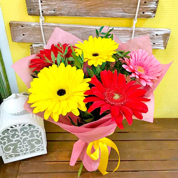 поможет солнечное сочетание пестрых гербер. Нежно розовый цвет намекнет о симпатии, желтый о дружеском интересе, оранжево-красный станет комплиментом, а насыщенно-розовый